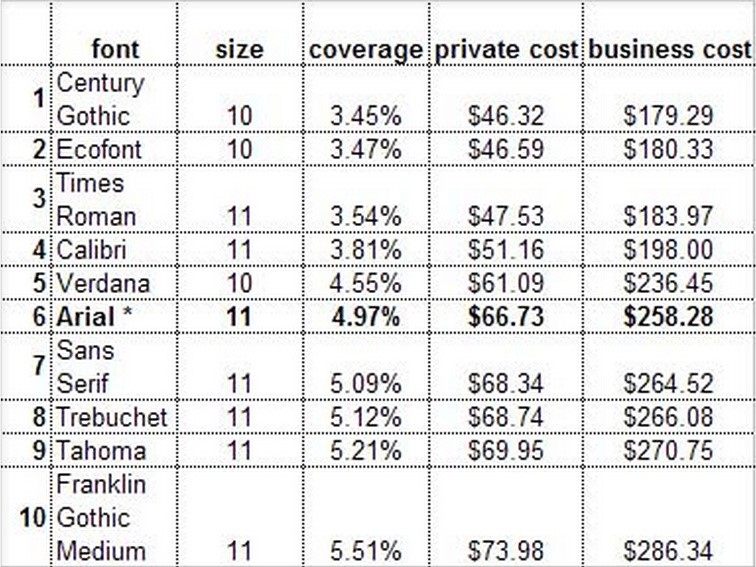 Here is a list of the 10 most commonly used fonts and their printing costs