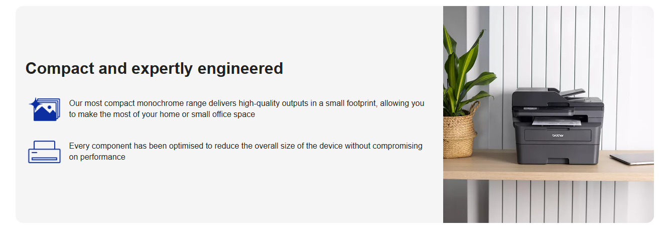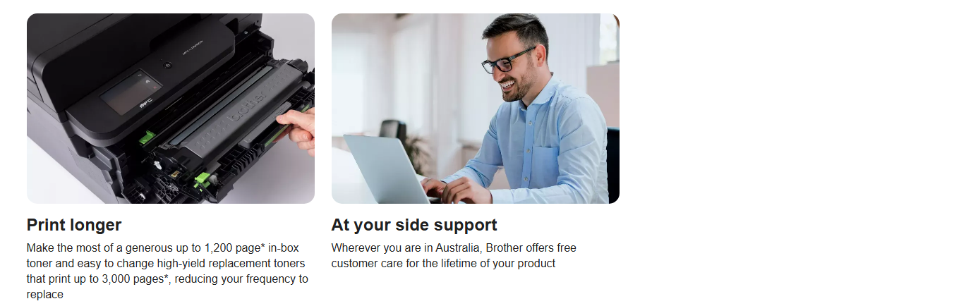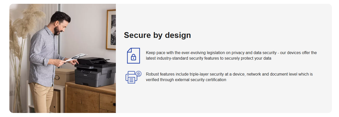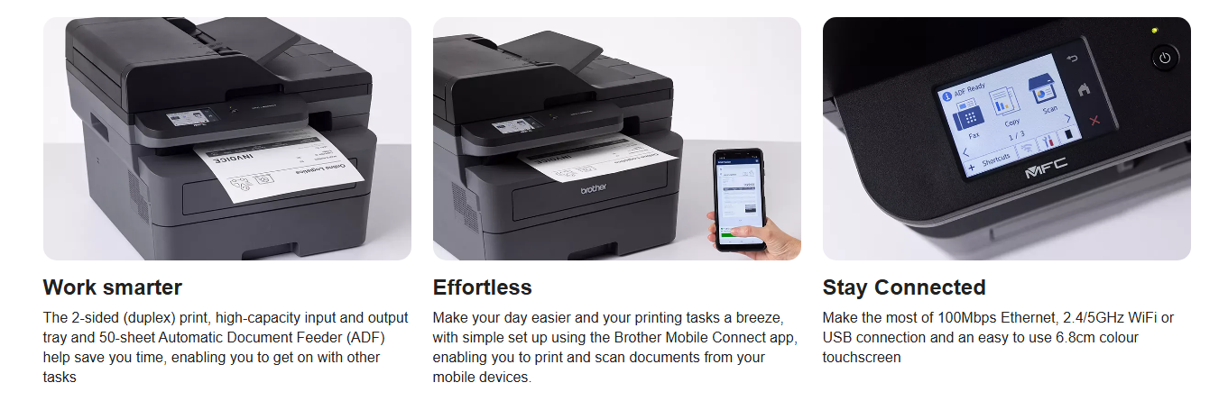 Work smarter with an expertly designed machine, built for effortless efficiency. Keep your home or small office moving with long-lasting supplies with up to 3,000-page* replacement toners and fast print speeds of up to 32ppm. Offering the latest industry-standard security, this compact device features a generous 6.8cm touchscreen. Experience flawless results reliably, every day.