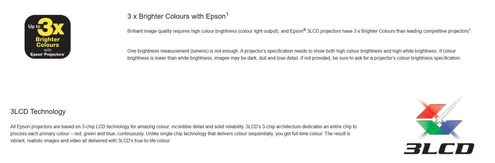 • Up to 3x brighter colours and reliable performance1 – 3LCD, 3-chip technology. Look for both high colour brightness and high white brightness