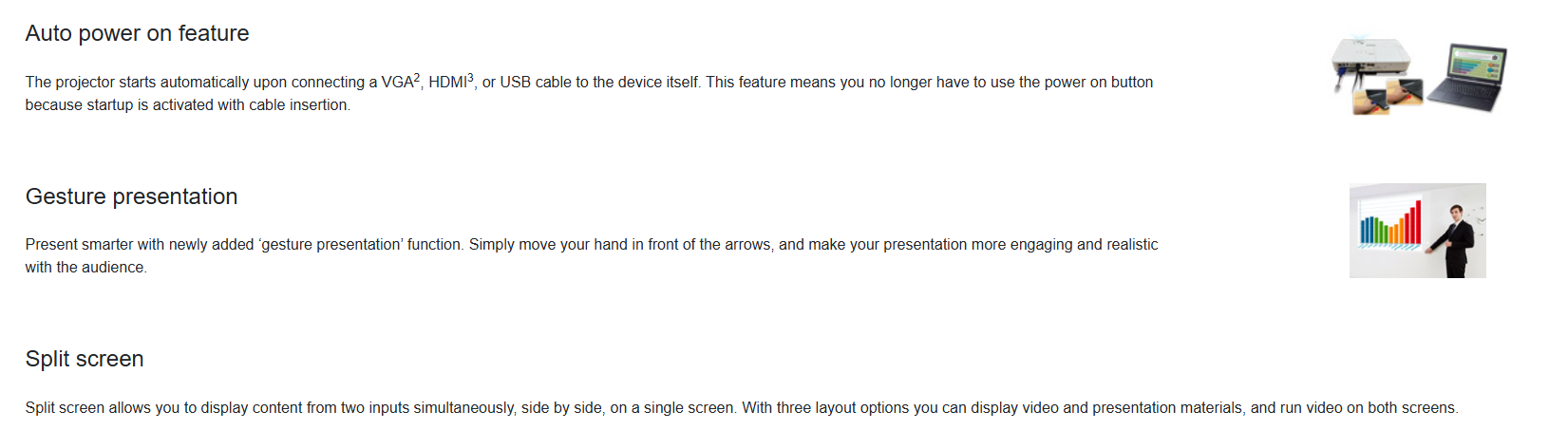 • Split screen – simultaneously project two images, video or still, side by side, from two different sources