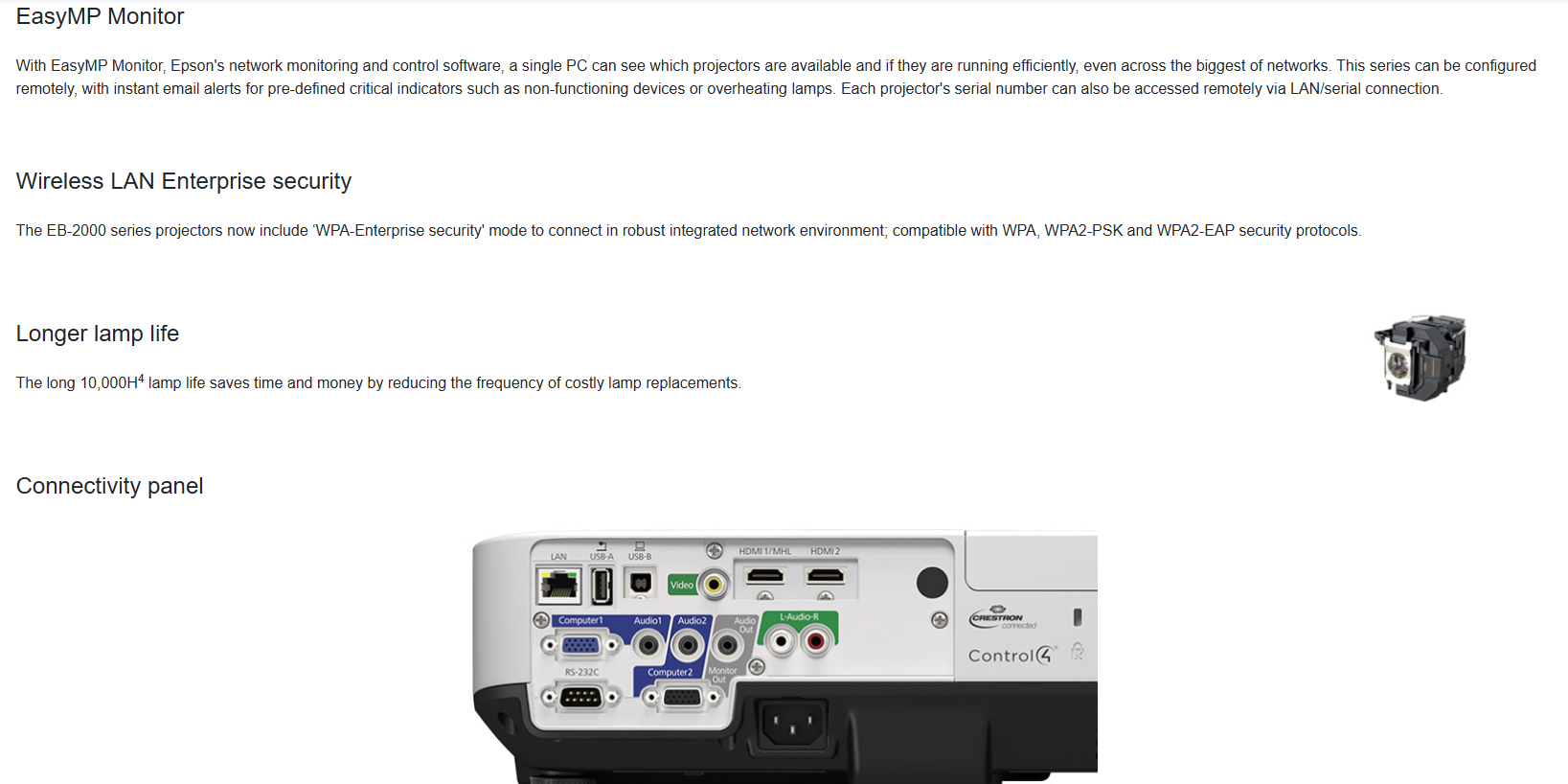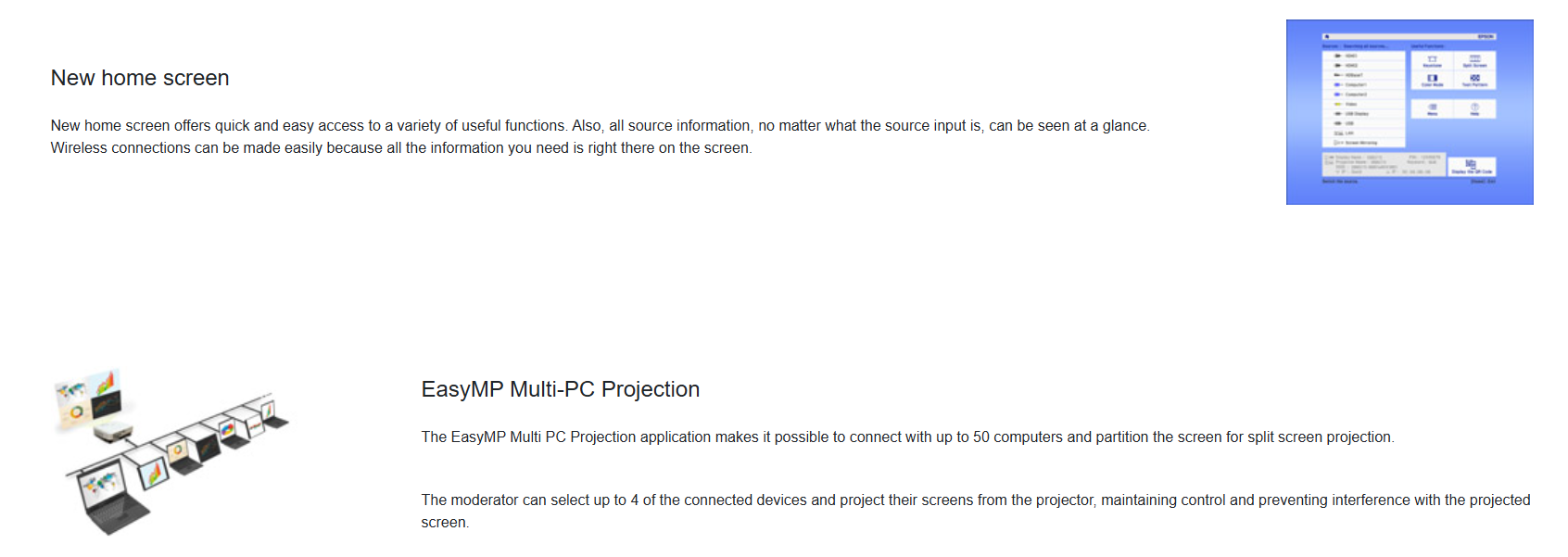 • Remote network monitoring and control – plus message broadcasting and built-in schedule functions with EasyMP® software / Multi-PC Projection