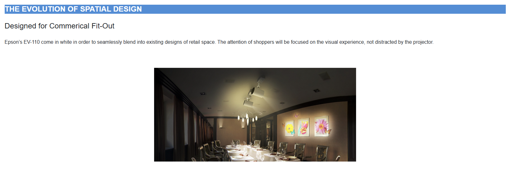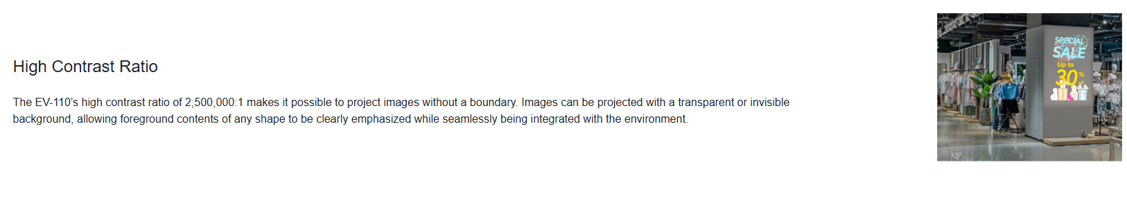 • Scalable, for an array of applications – install multiple EV-110 projectors and utilise Edge Blending technology for versatile, breathtaking displays