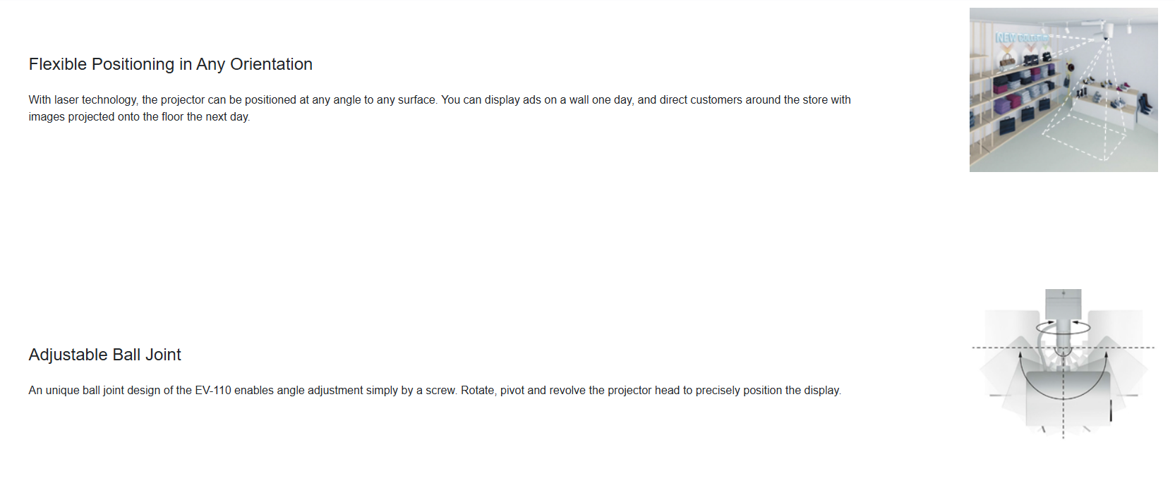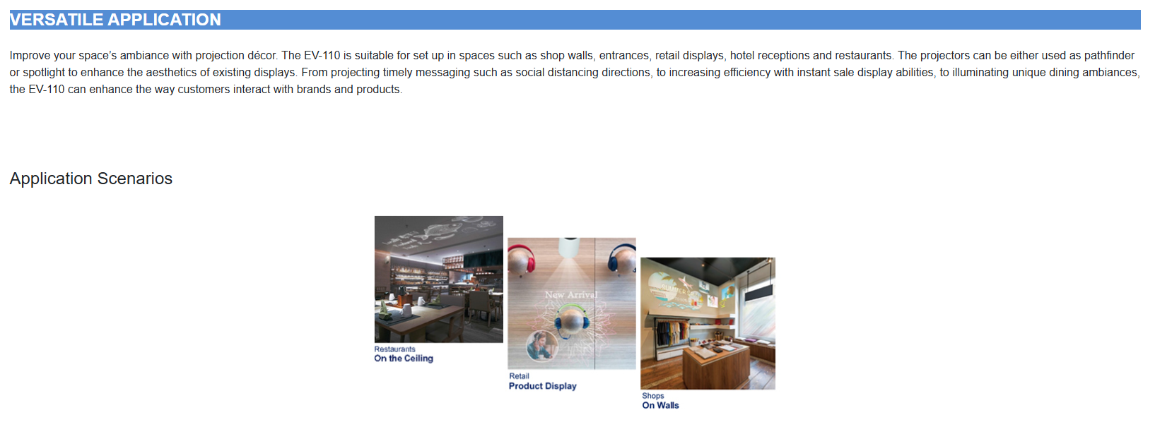 • Create head-turning digital signage – illuminate and project on virtually any surface or material, for digital art, commercial signage and décor applications