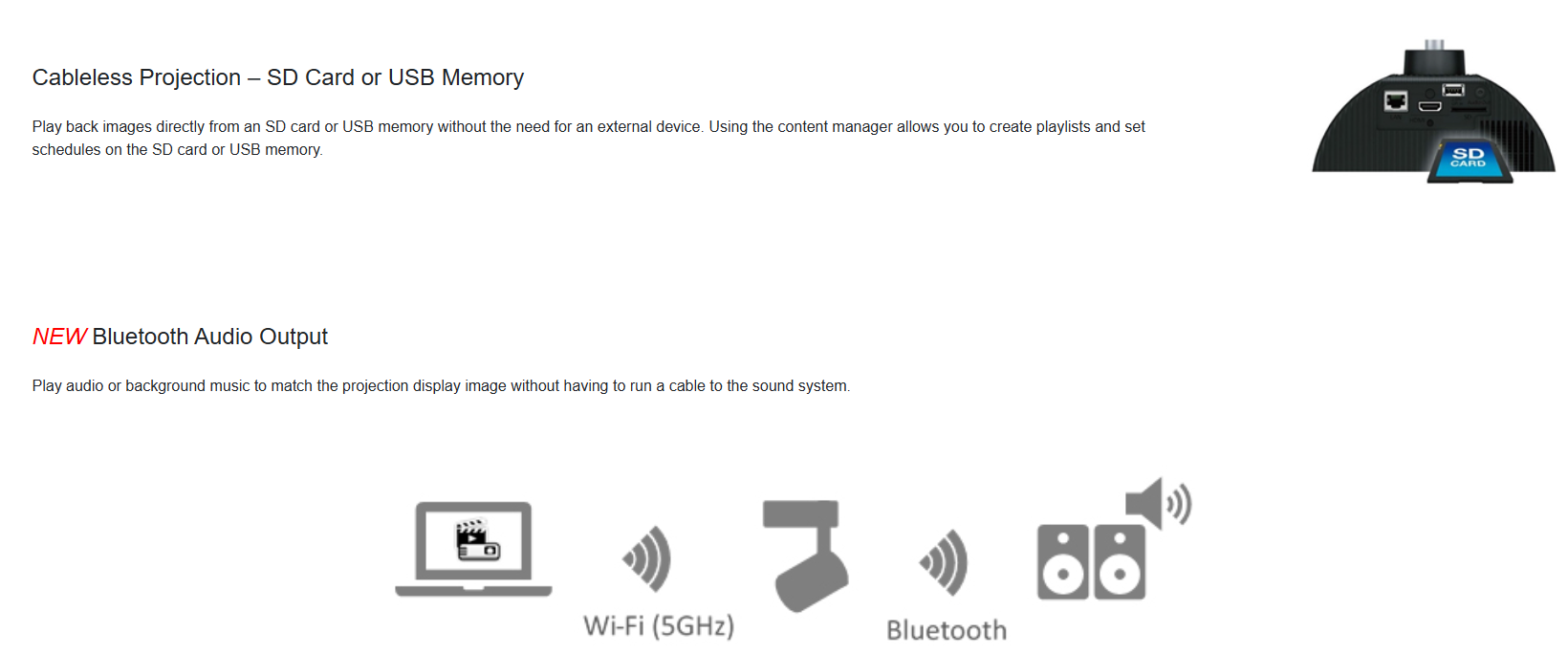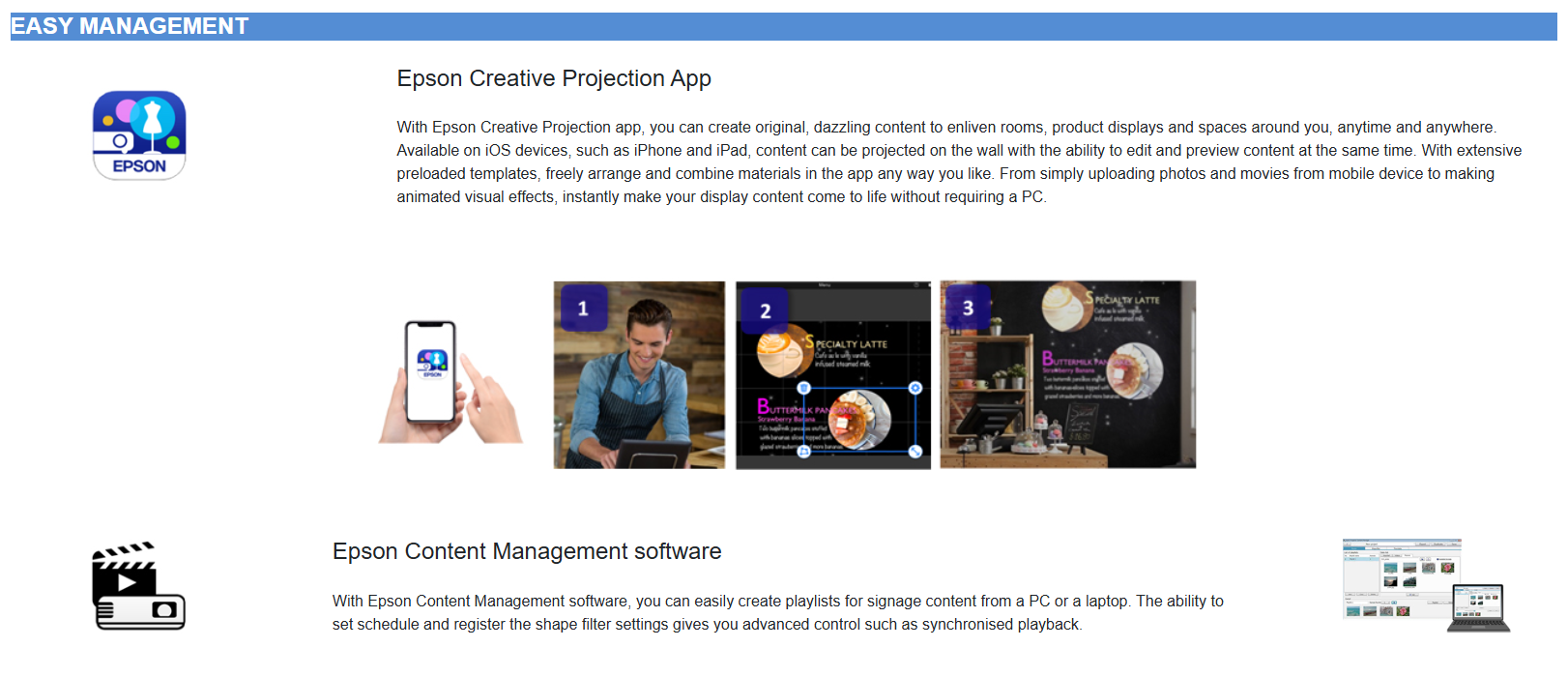 • DIY content creation – comes with templates, effects, colour filters and customisable options; playlist and playback function allow for seamless content management for single or multiple projectors