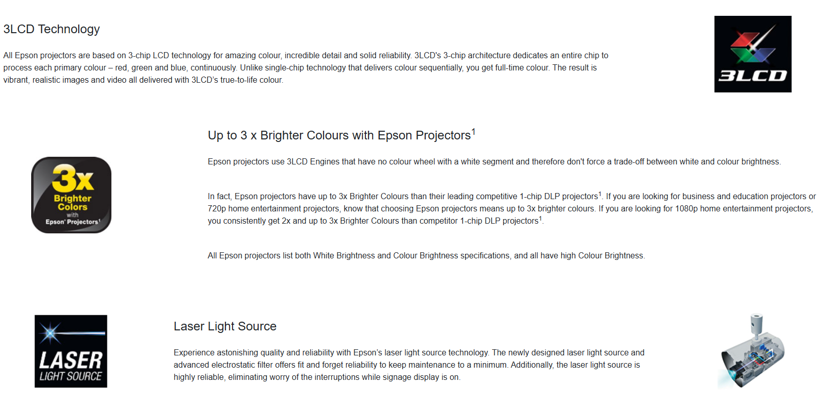 • 3 x Brighter Colours and Reliable Performance1 – 3LCD, 3-chip technology. Look for both high colour brightness and high white brightness