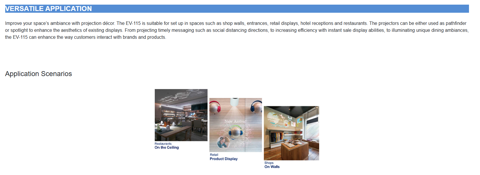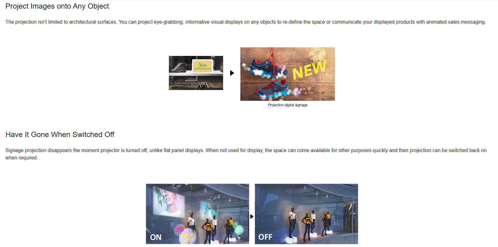 • Create head-turning digital signage – illuminate and project on virtually any surface or material, for digital art, commercial signage and décor applications