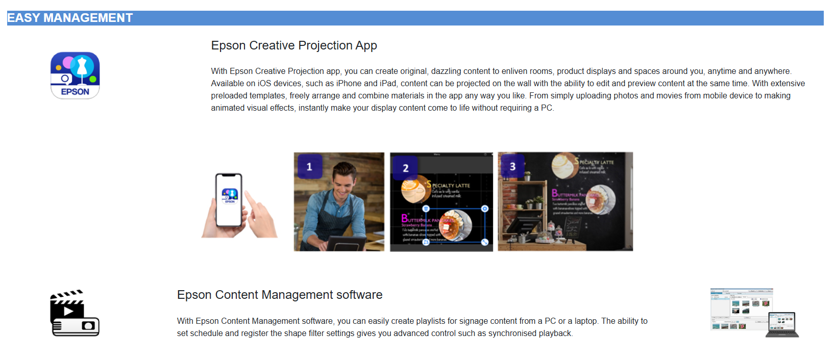 • DIY content creation – comes with templates, effects, colour filters and customisable options; playlist and playback function allow for seamless content management for single or multiple projectors