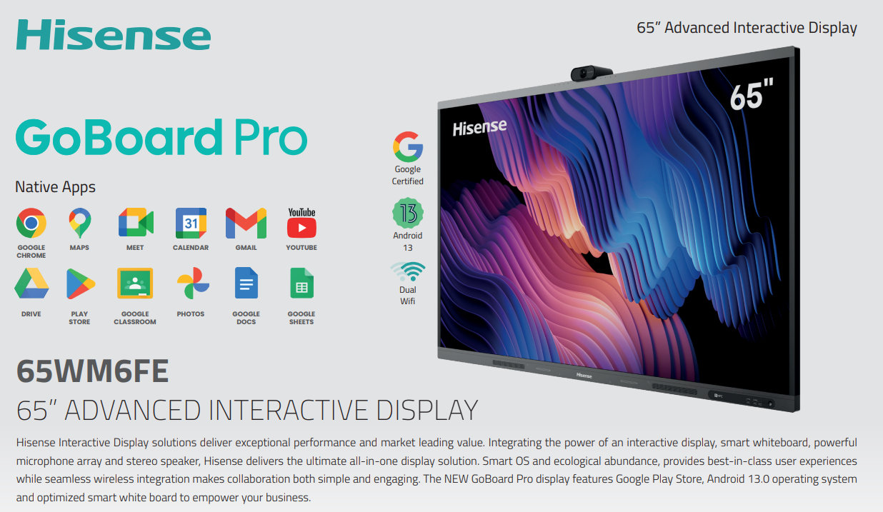 Hisense 65" GoBoard Live Pro 4k Google EDLA Certified Android 13 Interactive Display with Camera
