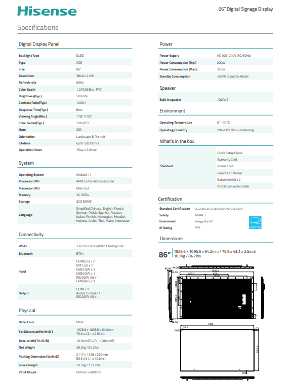 Hisense 86DM66D 86” Full HD IPS Digital Signage Display