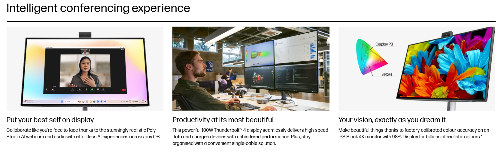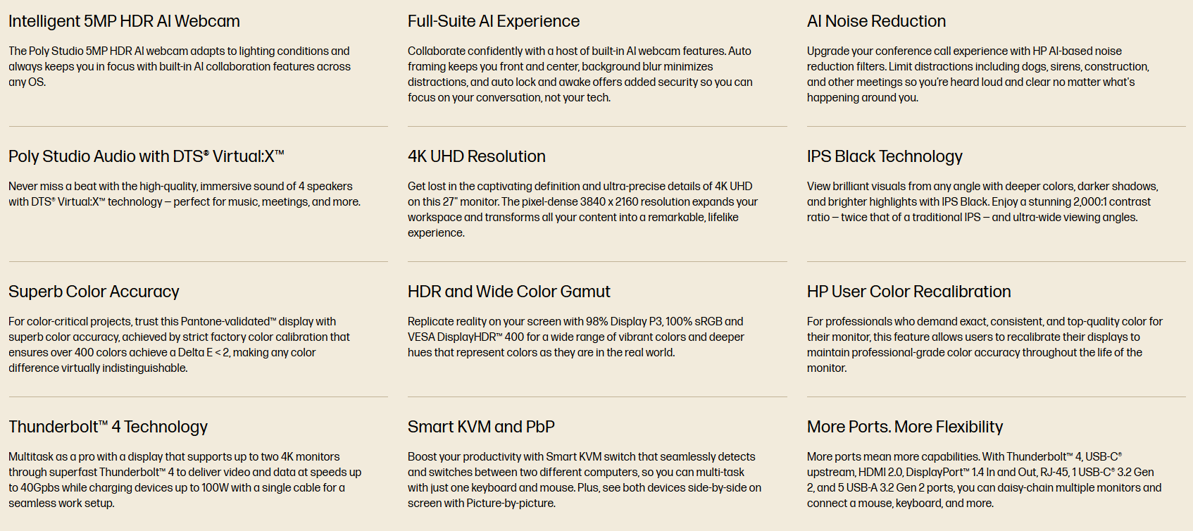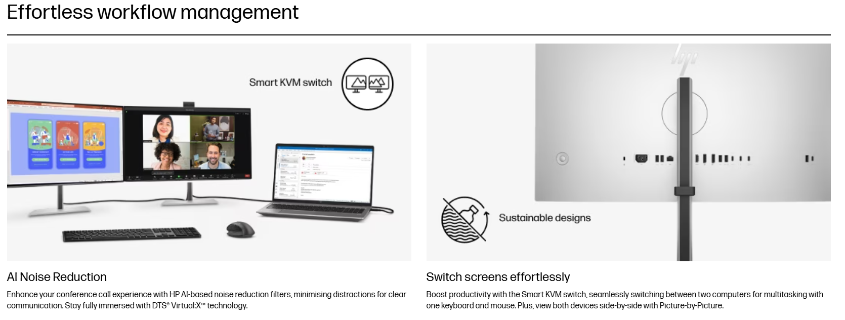 - Single Power ON, Integrated speakers, HP Eye Ease, Integrated microphone, Ambient light sensor, KVM switch, Daisy chain, Picture-in-Picture, Picture-by-Picture, Presence detection sensor, Pantone validated, Factory colour calibration, HP User Colour recalibration