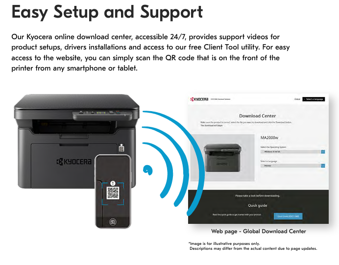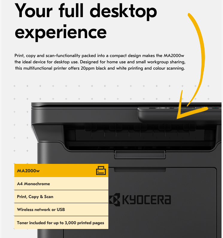 Print, copy and scan-functionality packed into a compact design makes the MA2000w the ideal device for desktop use. Designed for home use and small workgroup sharing, that multifunctional printer offers 20ppm black and white printing and color scanning.