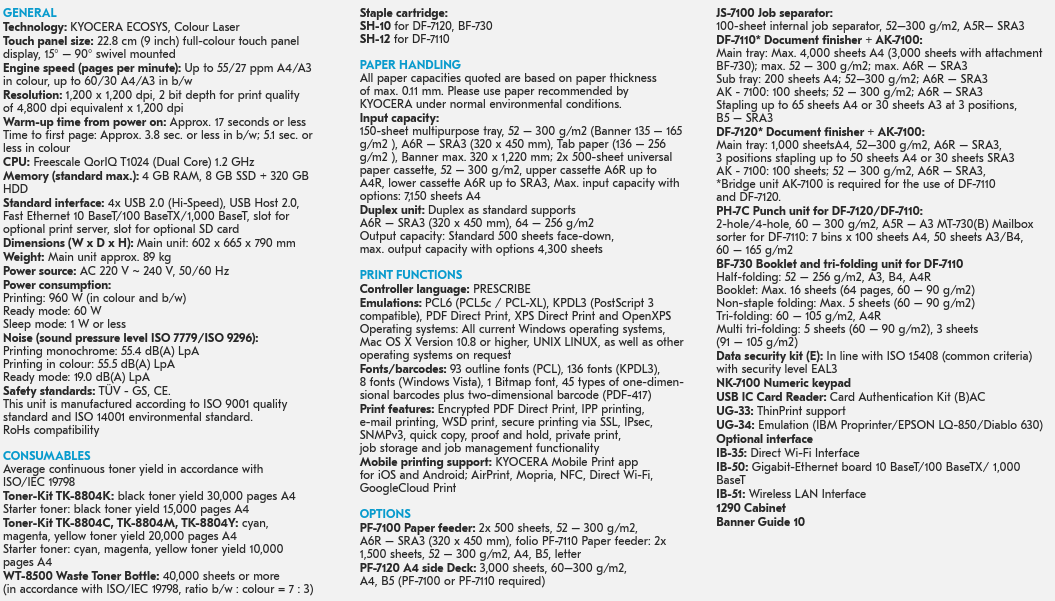 Consumables : TK-8804K 30,000 Page Yield Black Toner / TK-8804C Cyan / TK-8804M Magenta / TK-8804Y Yellow 20,000 Page Yield Toners / WT-8500 70,000 Page Waster Toner Bottle