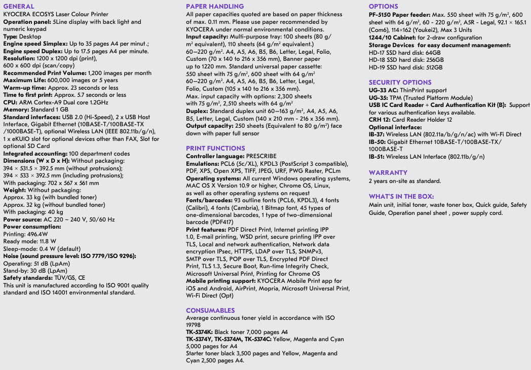 Consumables : TK-5374K Black 7000 Page Yield Toner + TK-5374C Cyan / TK5374M Magenta / TK-5374Y Yellow 5000 Page Yield Toners