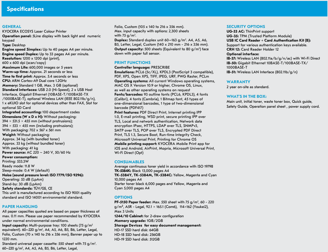 Consumables : TK-5384K 13K Yield Black Toner & TK-5384C / TK-5384M / TK5384Y 10K Yield Toner