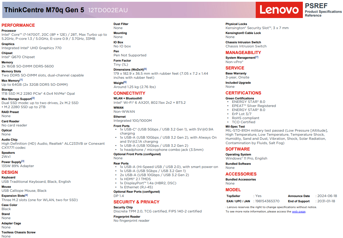LENOVO ThinkCentre M70Q G5 TINY Business PC i7-14700T 32GB 1TB WIFI W11P
