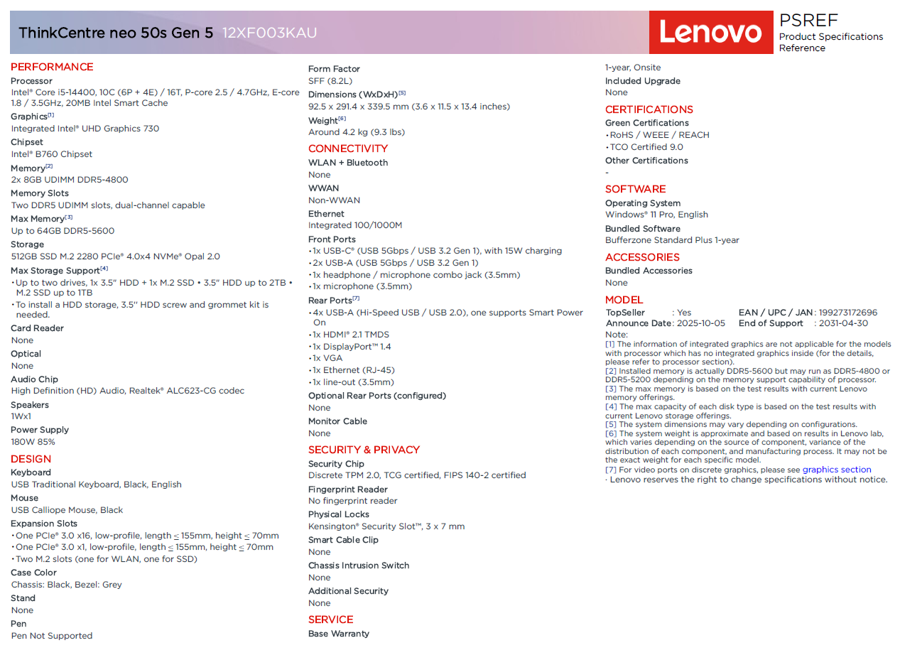 LENOVO ThinkCentre NEO 50S G5 SFF Buisness PC i5-14400 16GB 512GB W11P