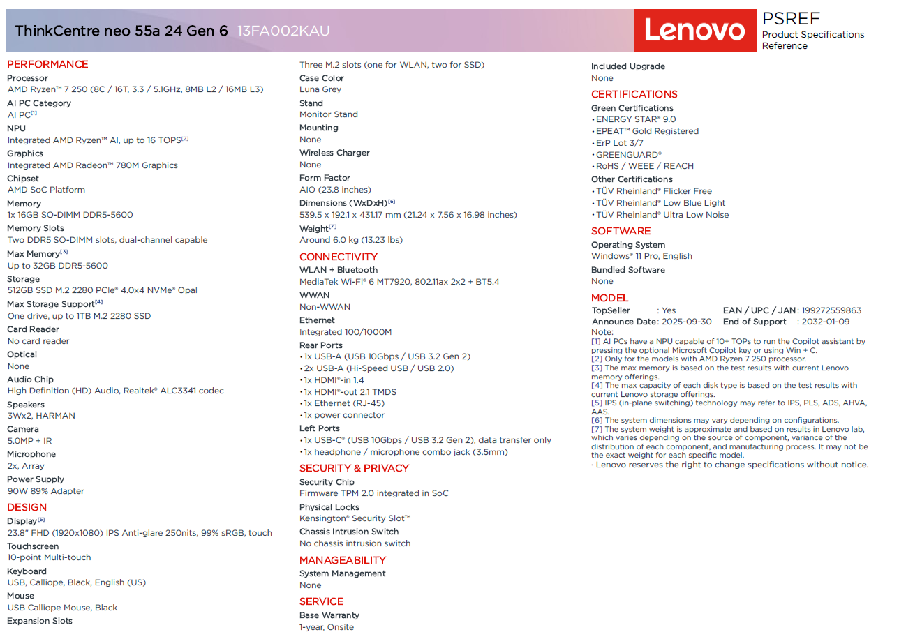 LENOVO ThinkCentre NEO 55A G6 AIO 23.8" Touchscreen Business PC AMD Ryzen 7-250 16GB 512GB WIFI W11P