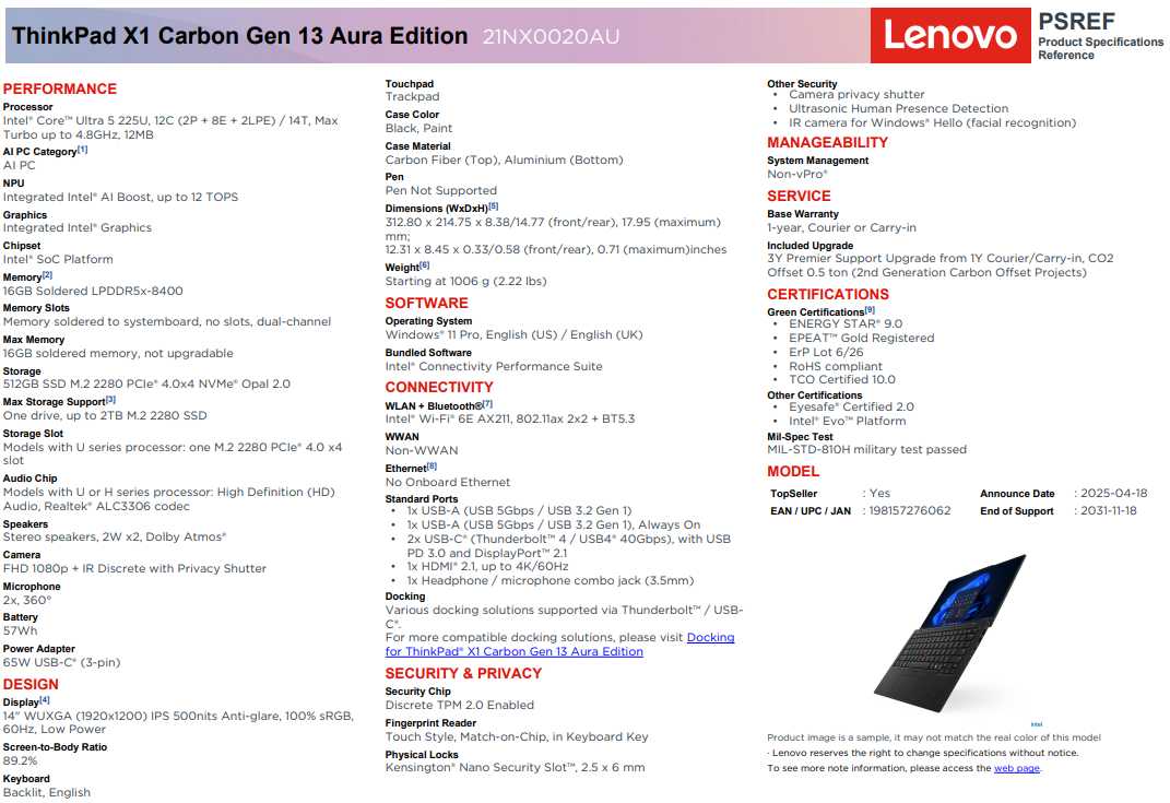 LENOVO ThinkPad X1 CARBON G13 Aura 14" Business Laptop U5-225U 16GB 512GB W11P