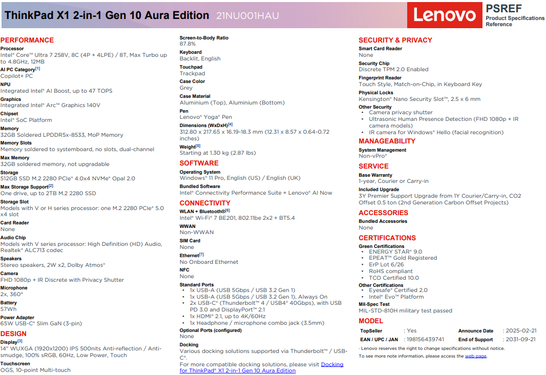 LENOVO ThinkPad X1 G10 2-IN-1 14" Copilot+ PC U7-258V 32GB 512GB W11P