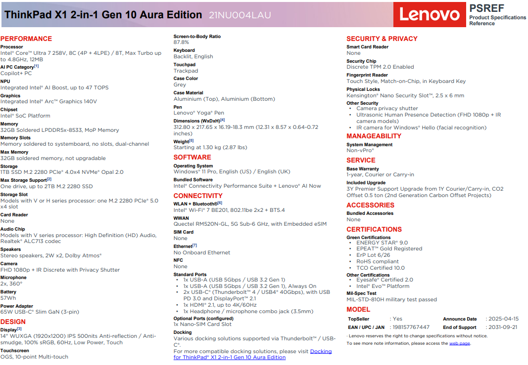 LENOVO ThinkPad X1 G10 2-IN-1 Copilot+ PC U7-258V 32GB 1TB 5G LTE W11P
