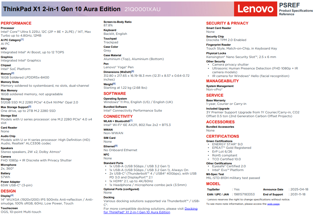 LENOVO ThinkPad X1 G10 Aura 2-IN-1 Business Laptop U5-225U 16GB 512GB W11P