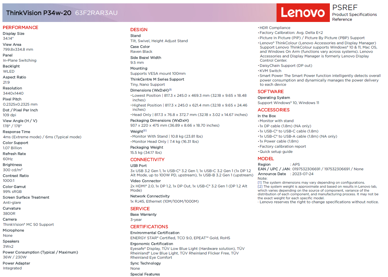 Lenovo ThinkVision P34w-20 34" UWQHD IPS Curved Business Monitor (100W USB-C PD + Hub)