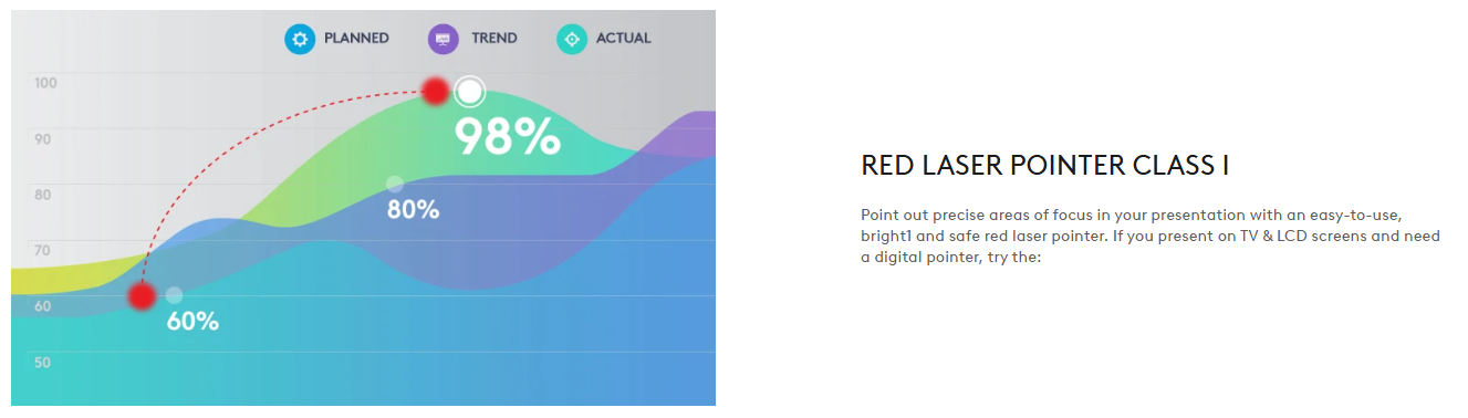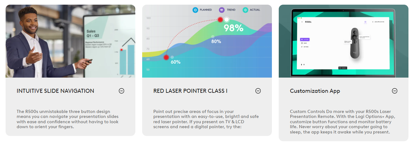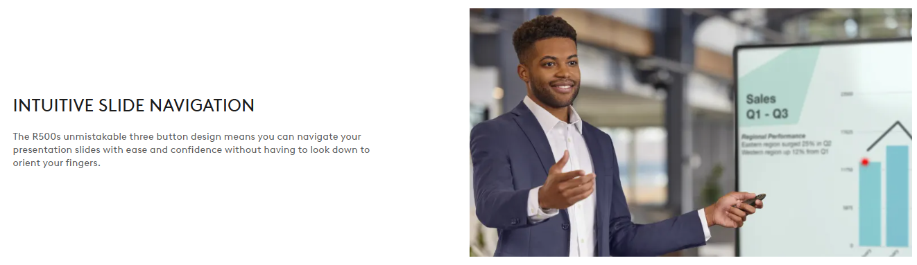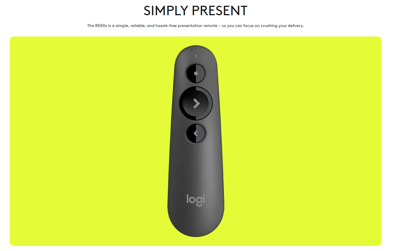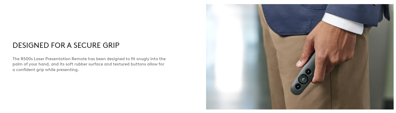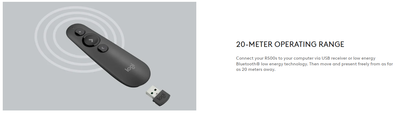 Deliver impactful presentations with the R500s Laser Presentation Remote. Move freely and navigate slides from up to 20 meters away – and point out precise areas of focus with the red laser pointer. The R500s is optimized to work with Windows®, macOS and leading presentation software.