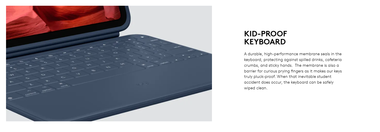 Students can type quickly and accurately with a physical keyboard, all while building skills, completing assignments, and taking tests. With many testing agencies recommending or even requiring an external keyboard,1Per Logitech 2020 interviews with testing agencies. Obtained by independent interviews with testing agencies conducted by Logitech in 2020. Logitech interviewed independent testing agencies in 2020.the Rugged Combo 4 is perfect for learning on iPad.