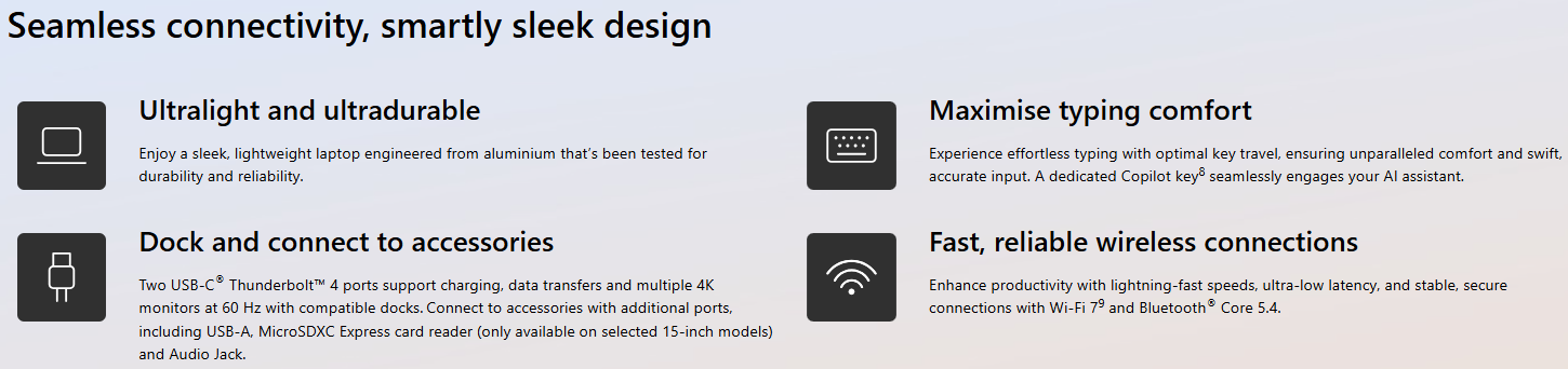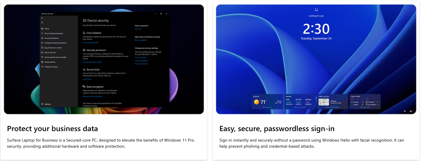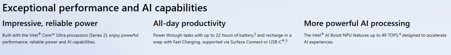 Surface Laptop for Business, 7ᵗʰ Edition, the first Copilot+ PC built exclusively for business with Intel® Core™ Ultra processors (Series 2) .Tackle demanding workloads with powerful performance, long battery life and new, unique AI experiences only available on Copilot+ PCs that help make your device smarter, faster, and more creative.