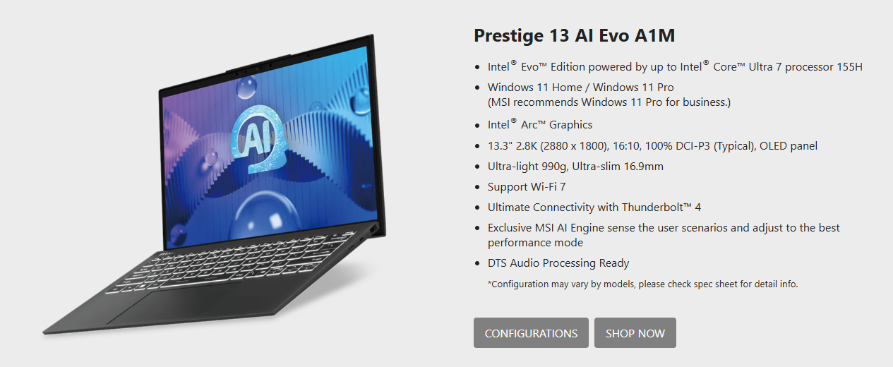 • MSI Prestige 13.3" 2.8K OLED Business Laptop U7-165H 16GB 512GB W11P
