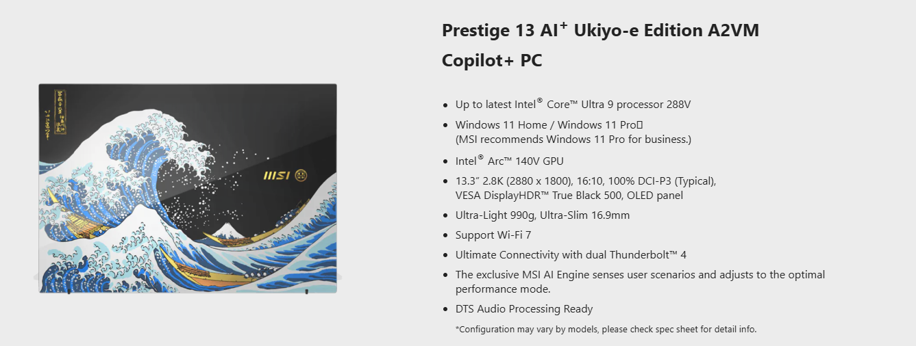 • MSI Prestige 13 AI+ Ukiyoe Edition CoPilot+ PC U9-288V 32GB 2TB W11P