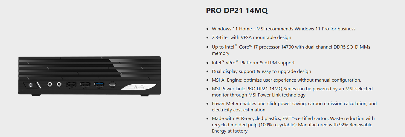 • MSI PRO DP21 Mini Business PC i7-14700 16GB 1TB WiFi W11P