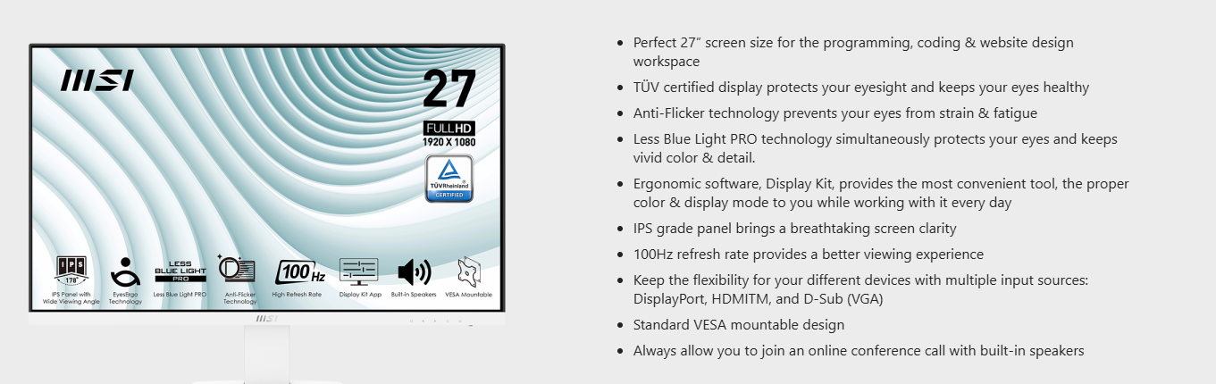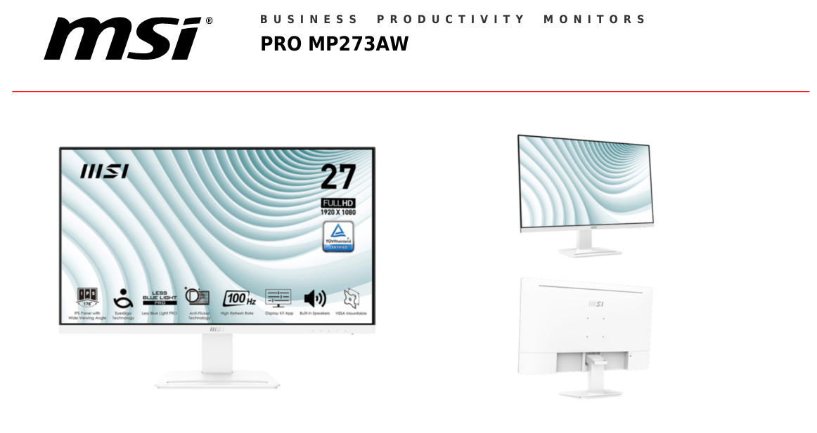 • MSI PRO MP273AW 27" FHD 100Hz IPS Business Monitor - White