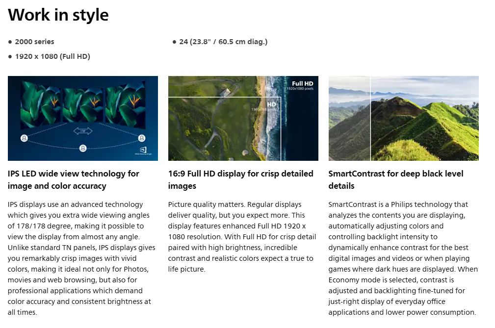 PHILIPS 24E1N2300A USB-C Monitor. 23.8in IPS FHD 1920x1080 16:9 250nits 4ms 120Hz HDMI USB-C PD65W 2Wx2 Speakers Tilt VESA 3Yr Wty