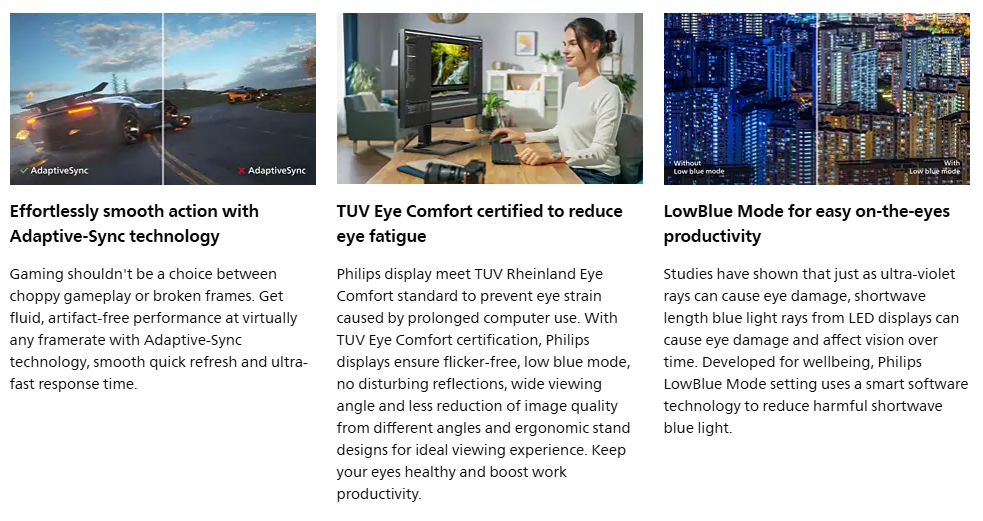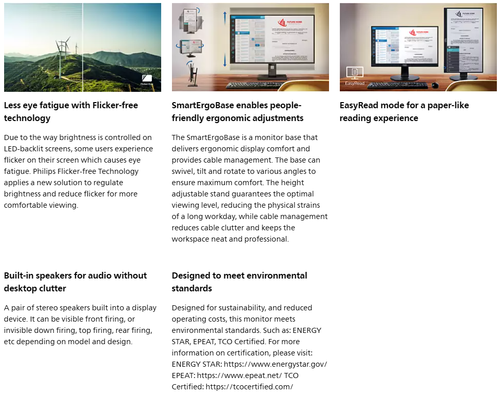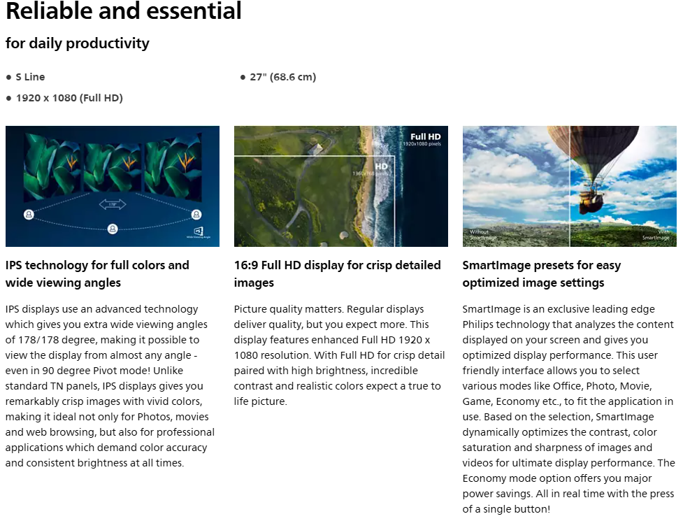 Philips S Line monitor gives essential features for daily productivity and work comfortably. Virtually frameless with crisp FHD for an expended and clear view. EasyRead and Eye comfort with TUV certified to reduce eye fatigue.