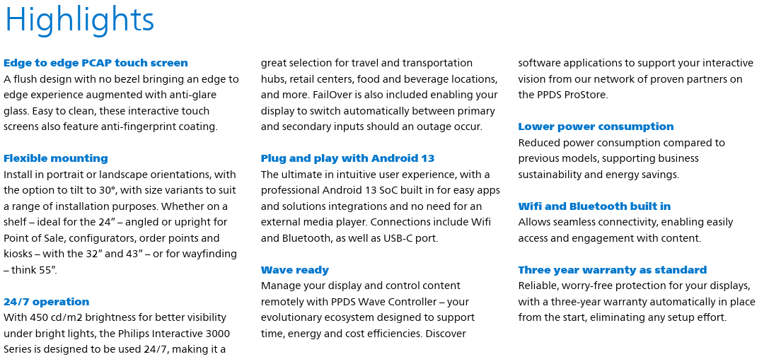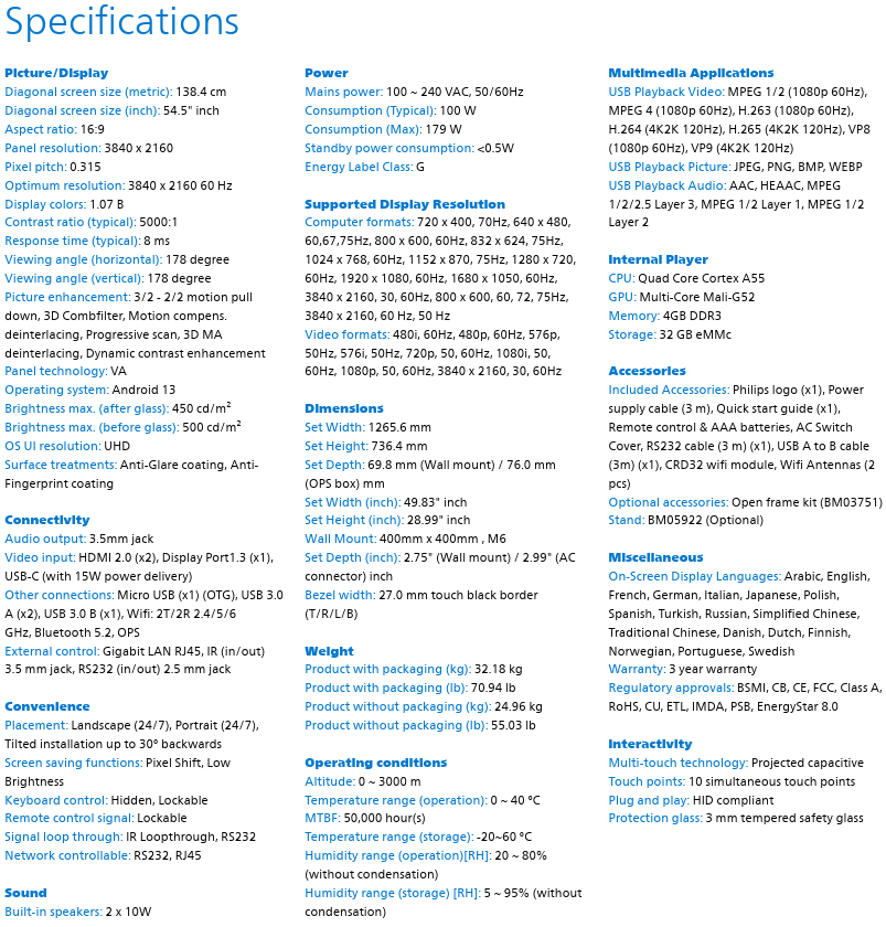 PHILIPS 55" T-LINE ANDROID 13 PCAP 10-TOUCH INTERACTIVE DISPLAY 450NIT UHD, 24/7 OPERATION, VESA 400x400, 3 YEAR WARRANTY