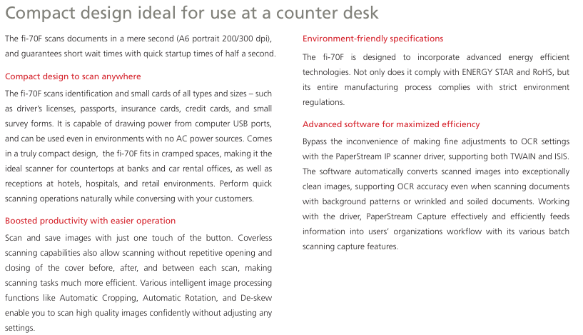 The fi-70F designed for portability and compact spaces guarantees simple and fast scanning for a variety of identification and small cards.