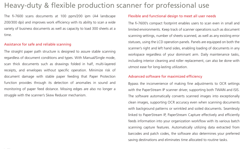 The fi-7600 allows you to scan A4 landscape documents at 100 ppm/200 ipm (200/300 dpi). The scanner is suitable for continuous scanning because it allows you to load up to 300 sheets at a time which improves efficiency when scanning a large volume of documents. In addition, various types of documents, such as thin paper, plastic cards envelopes, and long page documents can be scanned on this scanner.