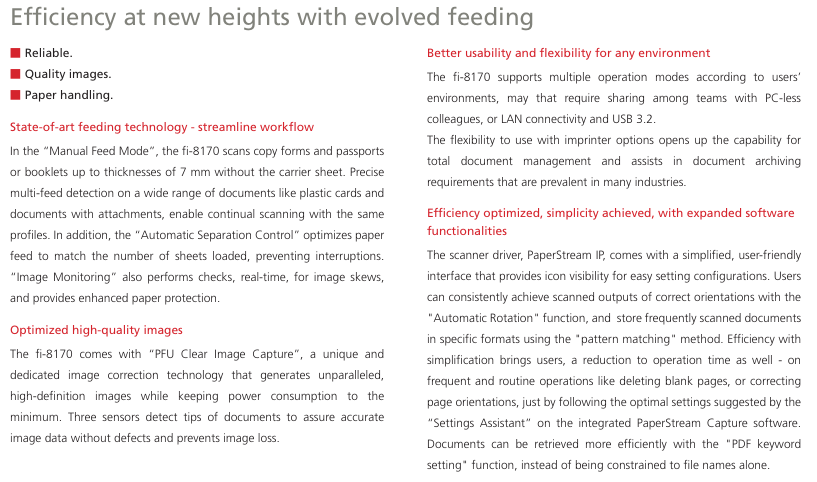 The fi-8170 offers an innovative and superior scanning experience. Compact and reliable, the scanner achieves scan speeds of 70 ppm/140 ipm (200/300 dpi, color, A4 portrait), loads up to 100 sheets at a time, and comes equipped with a capability of scanning up to as many as 10,000 sheets a day.