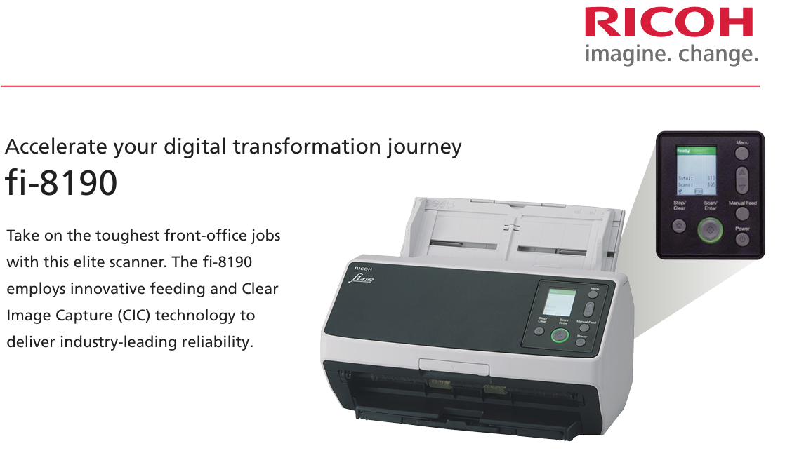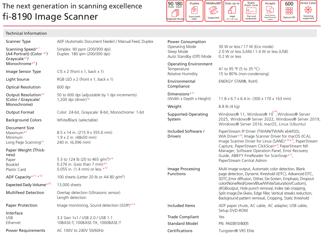 The fi-8190 provides unmatched performance and market-leading document imaging capabilities. Compact and reliable, the scanner achieves scan speeds of 90 ppm/180 ipm (200/300 dpi, color, A4 portrait), loads up to 100 sheets at a time, and comes equipped with a capability of scanning up to as many as 13,000 sheets a day.