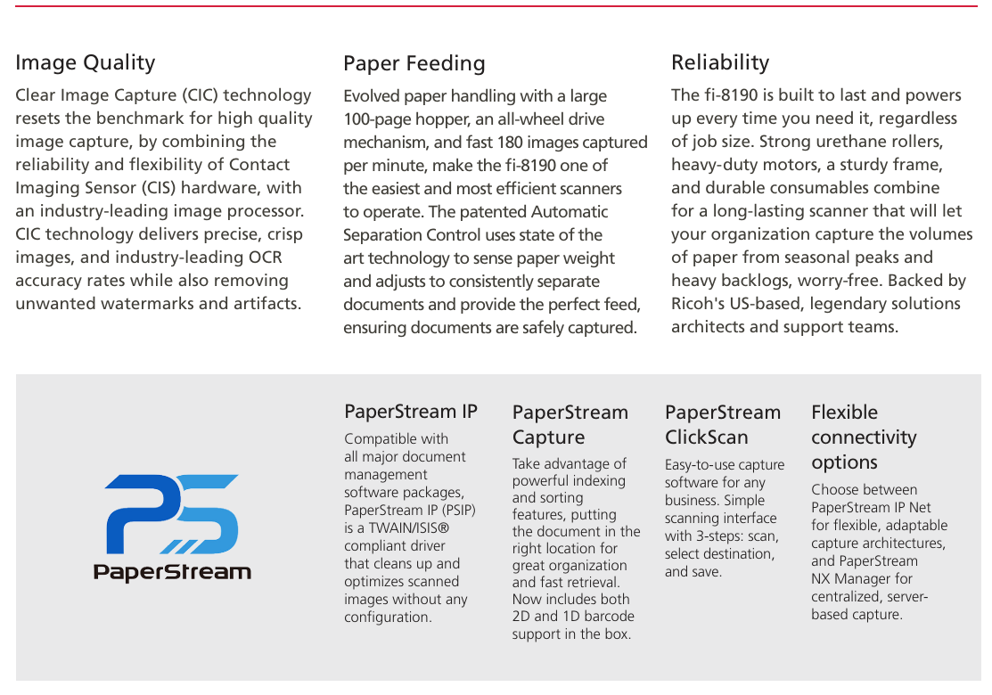 - PaperStream IP and PaperStream Capture providing advanced image processing functions, with PaperStream Capture Pro software as a premium option