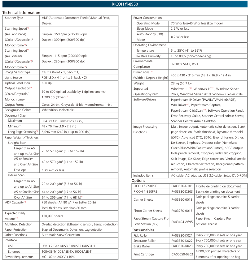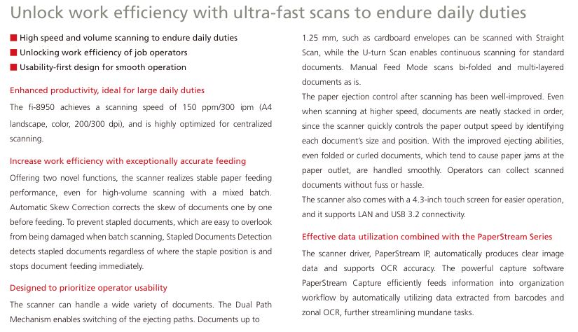 The fi-8950 is an A3 document scanner highly optimized for heavy duty scanning. The scanner comes with features that help reliable scanning, such as Automatic Skew Correction and Stapled Documents Detection. As an ideal model for scanning a large volume daily, the scanner offers speeds of 150 ppm/300 ipm (200/300 dpi, color, A4 landscape), loads up to 750 sheets at a time, and is capable of scanning up to as many as 130,000 sheets a day.
