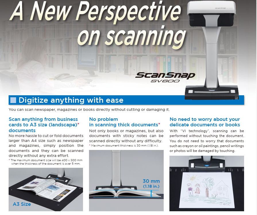 The ScanSnap SV600 Contactless scanner provides a new perspective on document scanning. Easily scan newspapers, magazines, documents or books directly without cutting or damaging them.