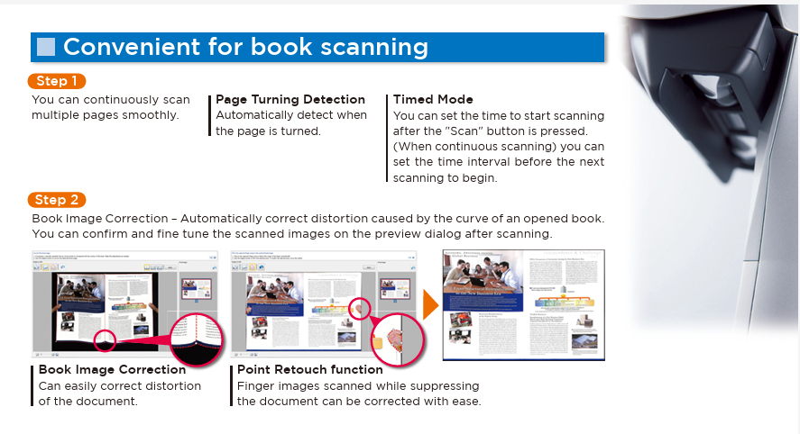 - Scans bound material and flat documents