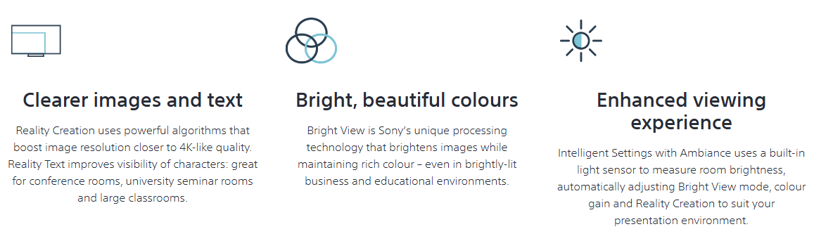 Even powerful projectors can suffer from washed-out colours in strongly-lit rooms. Exclusive to Sony, Bright View delivers high-impact imagery without sacrificing colour. Newly improved Reality Creation ensures images, diagrams and text look clear and sharp, even in bright conditions. Intelligent Settings with Ambiance matches projected images with your environment for an enhanced viewing experience. There’s even an ambient light sensor to measure room brightness.