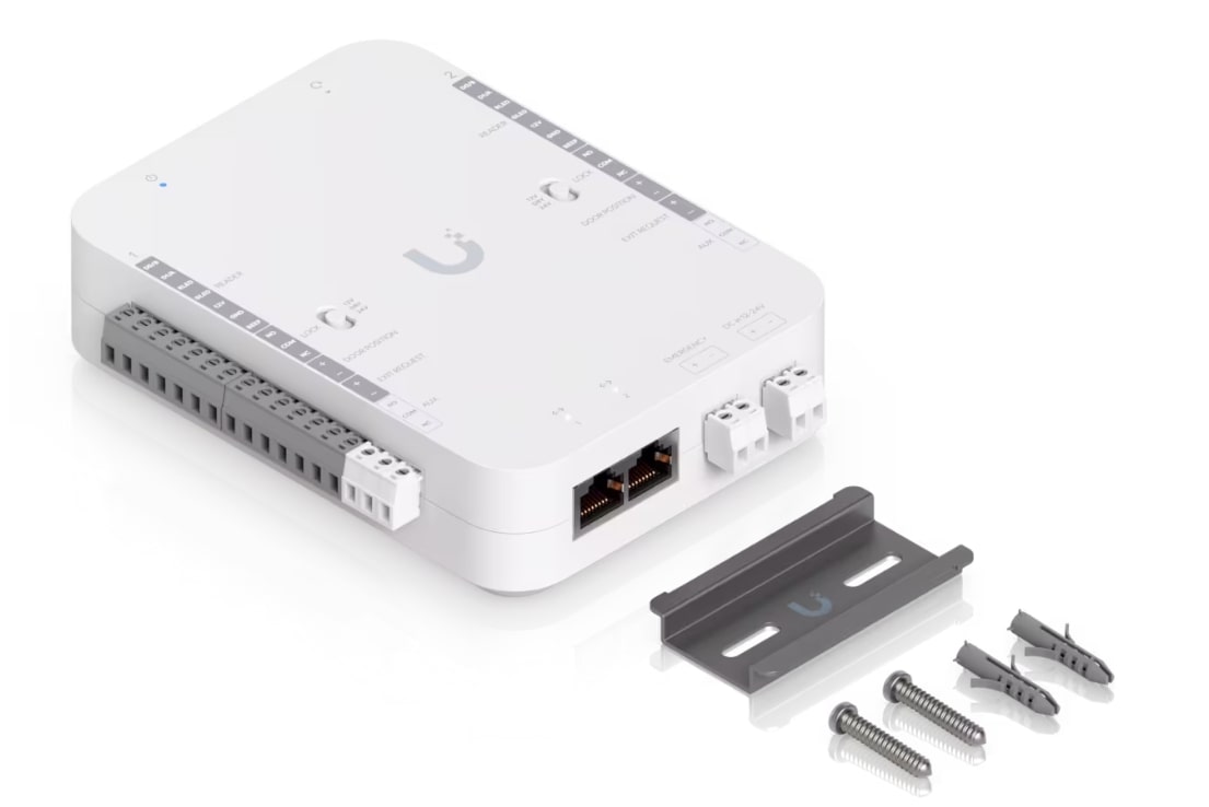 DC-powered hub that supports Wiegand and OSDP readers and provides entry and exit control for up to two doors.