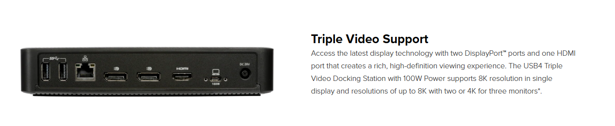 - Supports up to single 8K @60Hz, dual 8K@30Hz, or triple 4K@60Hz monitors with a USB4 host via one HDMI 2.1 and two DisplayPort™ 1.4 ports*/ ** / ***