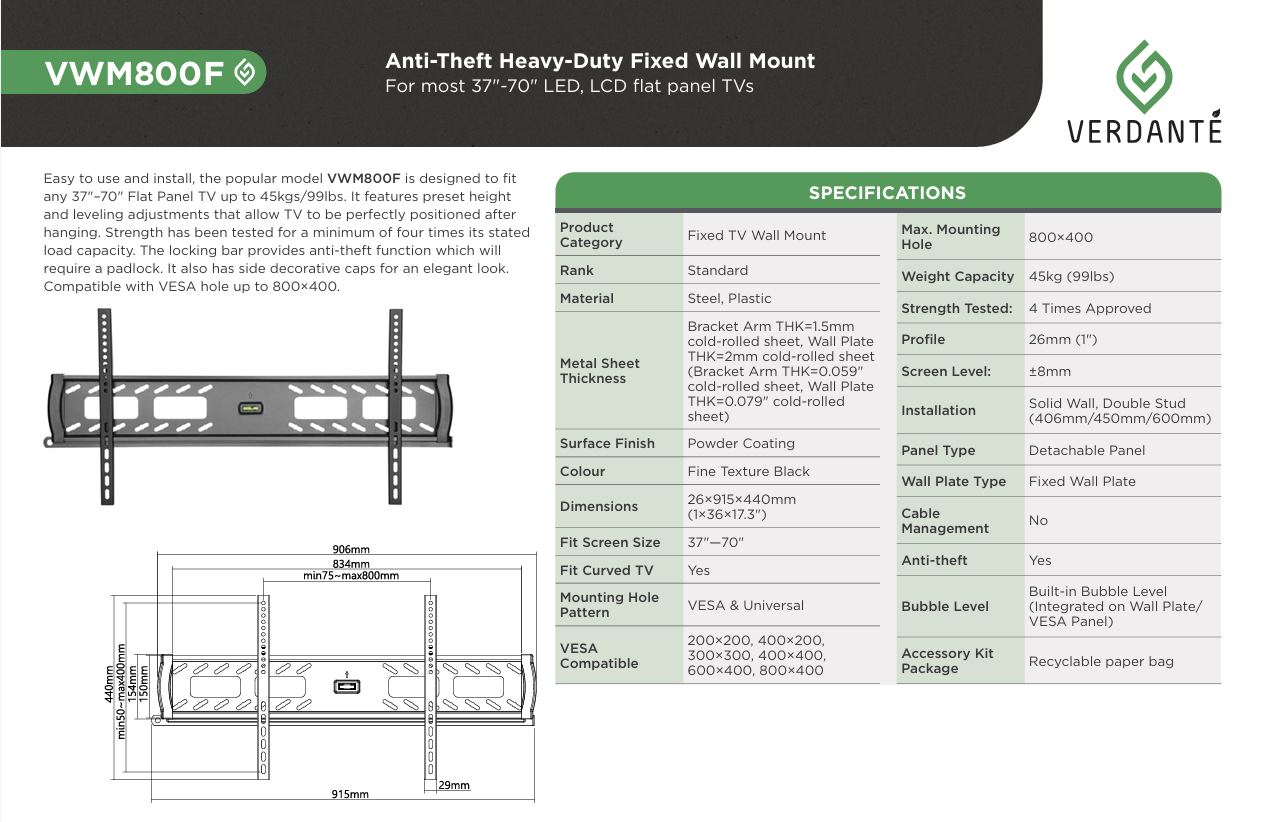 Verdante Heavy Duty Fixed TV Wall Mount (37" - 70" Max 45kg)
