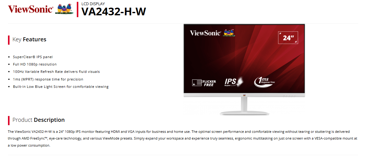 ViewSonic 24” 100Hz FHD IPS Monitor with Frameless Design - White