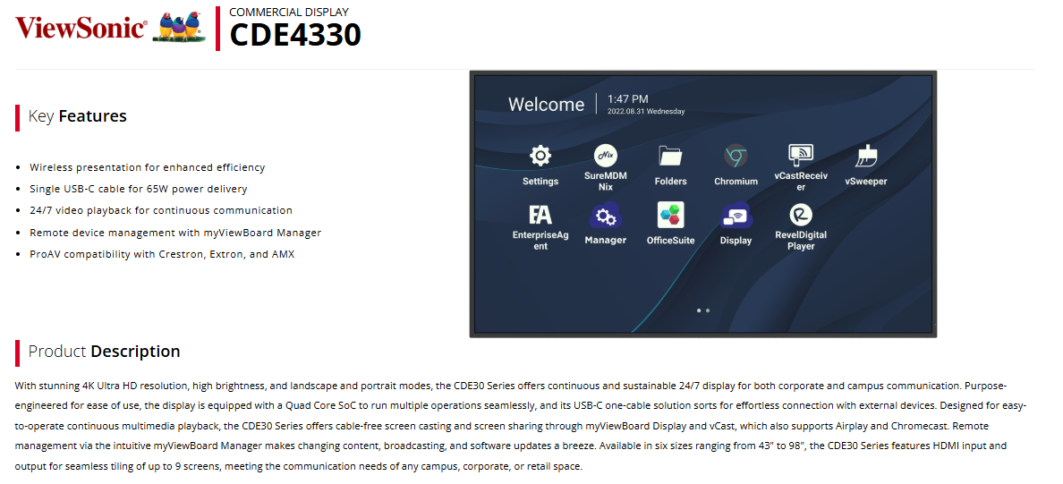 ViewSonic CDE4330 43' 4K Commercial Display